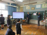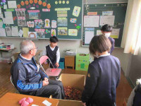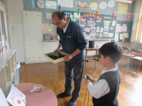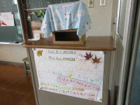 2025年12月10日 16時46分 季節はあっという間に冬へと移り変わってしまいましたが、1年生は秋に集めた葉っぱや木の実を使った「秋のお店」に校長先生と理科の先生をご招待しました。
