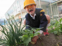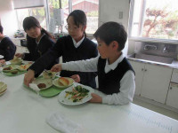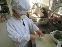 1年生は、にこにこ園で収穫したブロッコリーとかぶを使ってお料理です!栄養教諭の先生に教えていただいた、給食で大人気のメニュー「ブロッコリーの胡麻和え」と冬にとろりと温まる「カブのコンソメ煮」に挑戦です。食べやすい大きさに切ったり、計量スプーンで調味料を量りとったり、ゆでた野菜を崩さないようにふわっと和えたり・・・。全校のみんなの「おいしい」の表情を思い浮かべながら、盛り付けまで丁寧に頑張りました。お兄さん、お姉さんの「おっ!給食の味だね。おいしい!」の声に、にっこりの1年生でした。