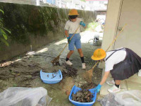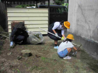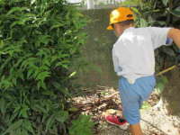 10月の収穫祭に向けて、学校の周りの草引きや落ち葉拾いを行いました。黙々と頑張る田滝っ子。20分の掃除を終えると、通路がピカピカになりました。