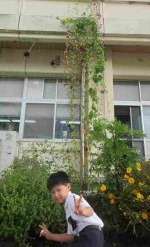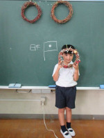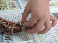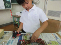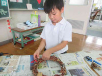 1年生は、生活科で育てた2階まで伸びたアサガオをリースにしました。そうすることで、大切に育てたアサガオとずっと一緒にいられると1年生もうれしそうです。初めてのホットボンドを使って、ドングリやクリスマス飾りをあしらい、1つ目の完成です。アサガオリースはあと2つできましたので、次の飾りつけも楽しみです。