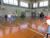 今日の全校体育では、先日のスローアンドキャッチラリーの練習と、長縄跳びの記録更新を目指して低・高学年に分かれての練習を行いました。