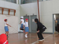 長縄を使ったいろいろな跳び方に挑戦することで、長縄跳びに慣れていくことから始めました。縄をうねらせて跳んでみたり、「ゆうびんやさん」の歌とともに跳んでみたり・・・。子どもたちが回して先生が跳んでみる場面も・・・。