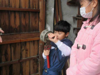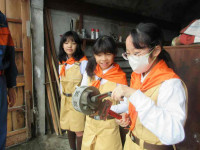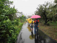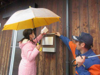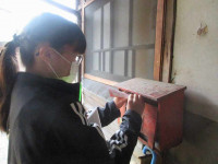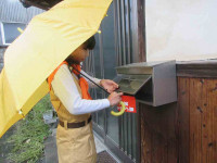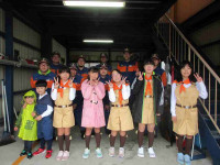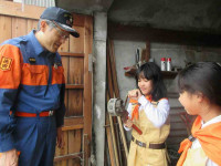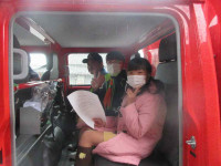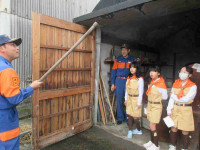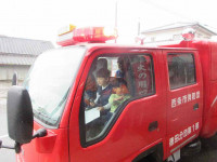 最初は、広報活動です。積載車に乗り込むと、田滝地区の皆さんに、みんなで火災を出さないように気を付けましょうと呼びかけます。1年生は初めての参加となりましたが、みんなゆっくりハキハキと伝えることができました。また、詰所の隣のポンプ蔵を開けて、消火活動や災害時に使用する様々な道具を見せていただくこともできました。山林火災などで背負って登るリュック状のホースの束を持ち上げた子どもたちからは、「えっ!これを背負ってですか?!」とその重さに驚きの声。消防団の皆さんのお仕事にも触れさせていただくことができました。最後は、地域の方のお家を回って、防火標語を配ります。田滝の安全安心を守っていきましょうと願いを込めて、一軒一軒ポストに入れていきました。